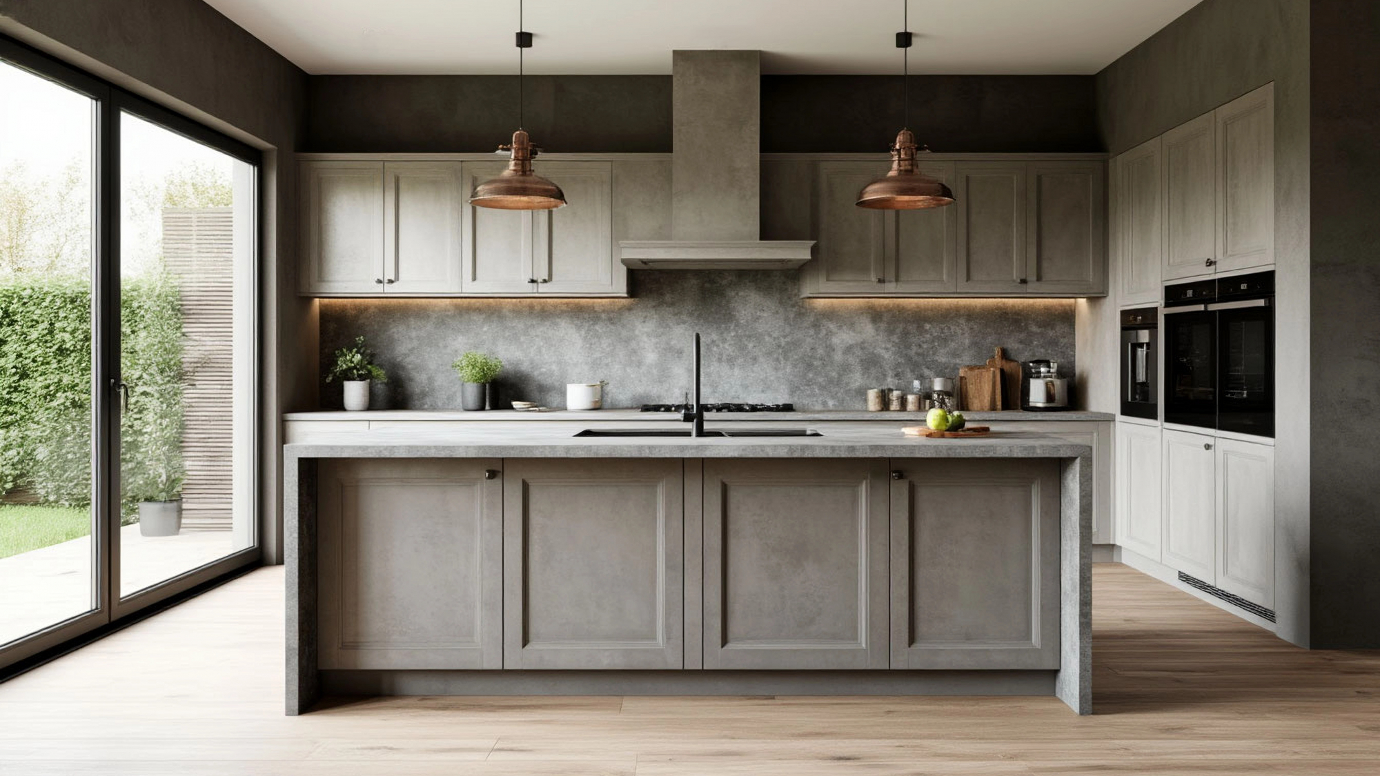 Важно и то, что такая кухня одинаково хорошо подходит как для просторных домов, так и для городских квартир. В больших пространствах она подчеркивает масштаб и архитектурность, в компактных — добавляет ощущение порядка и визуальной собранности. Классические формы делают интерьер более структурированным, а бетонный оттенок фасадов добавляет глубину, не перегружая пространство.