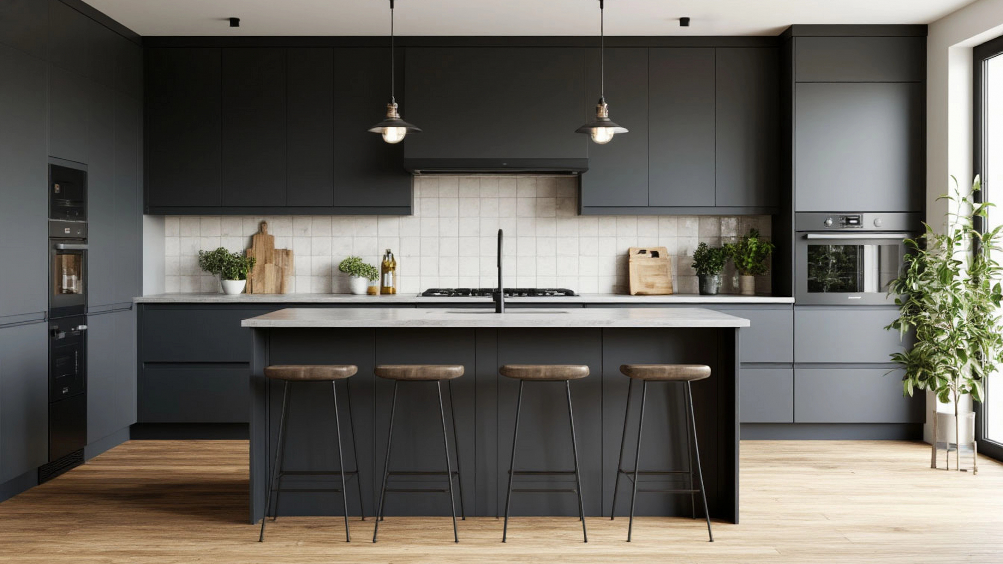 Концепция кухни "Тень" также хорошо раскрывается в сочетании с другими материалами и фактурами интерьера. Графитовый цвет фасадов гармонично взаимодействует с натуральным деревом, светлыми стенами, бетонными или каменными поверхностями, создавая спокойный и уравновешенный ансамбль. Такая кухня легко становится частью общего интерьерного сценария и не конфликтует с остальными элементами пространства. Она поддерживает идею скандинавского дома, где каждый предмет имеет свое место и работает на ощущение комфорта, а не на демонстрацию статуса или декоративной избыточности.
