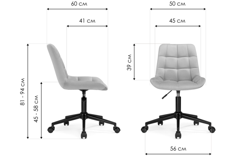 Диаметр крестовины: 56 см. Высота спинки: 39 см.